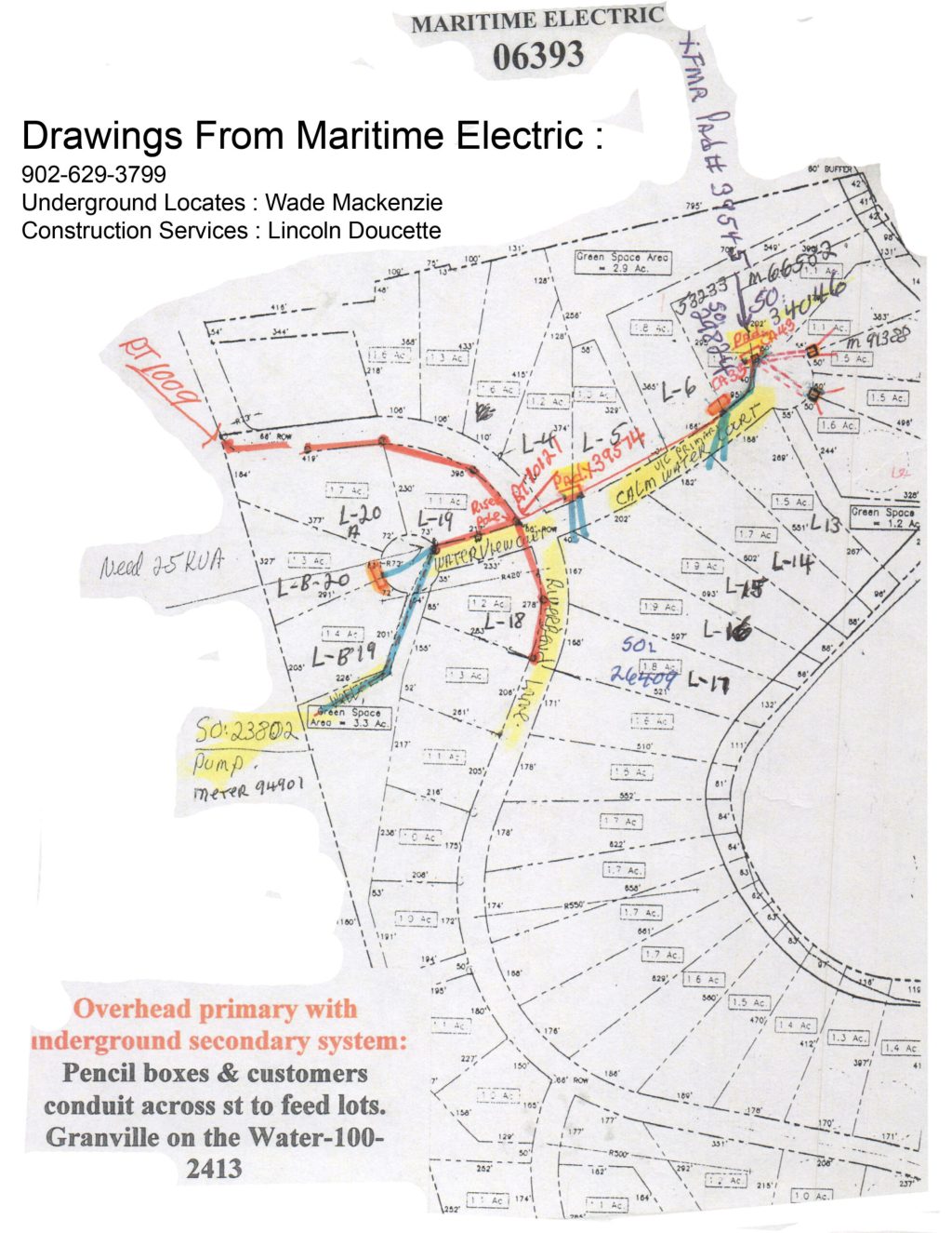 The electrical and water connections can be found near the front lot lines in Granville on the Water.   Electrical drawings are not the greatest from the first phases completed in the mid 2000’s.